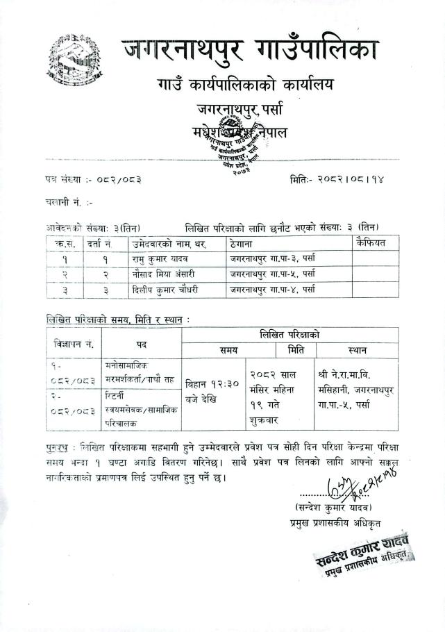» संक्षिप्त सूची प्रकाशन तथा लिखित परिक्षाको मिति तोकिएको सम्बन्धमा।