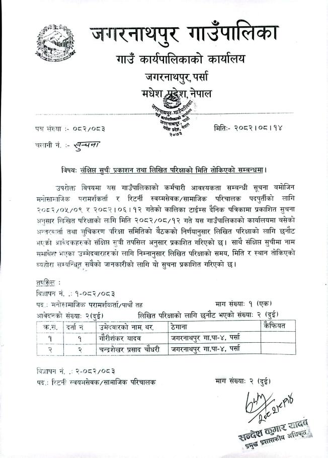 संक्षिप्त सूची प्रकाशन तथा लिखित परिक्षाको मिति तोकिएको सम्बन्धमा।